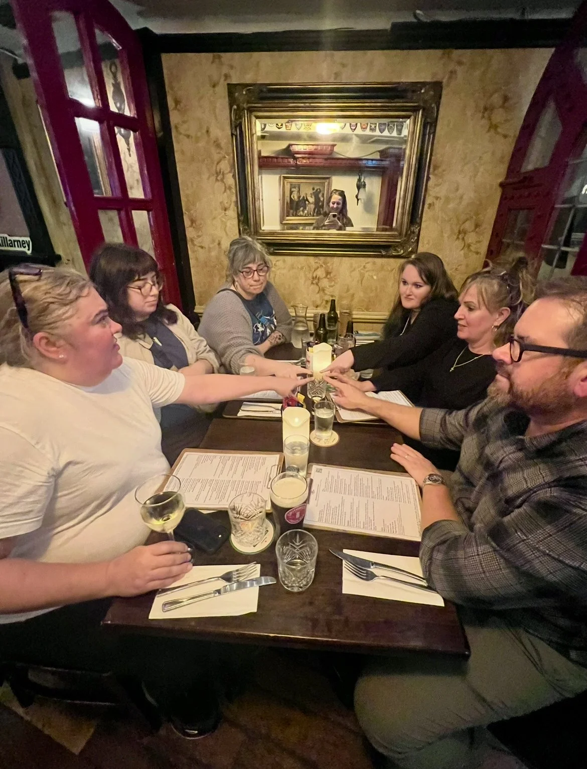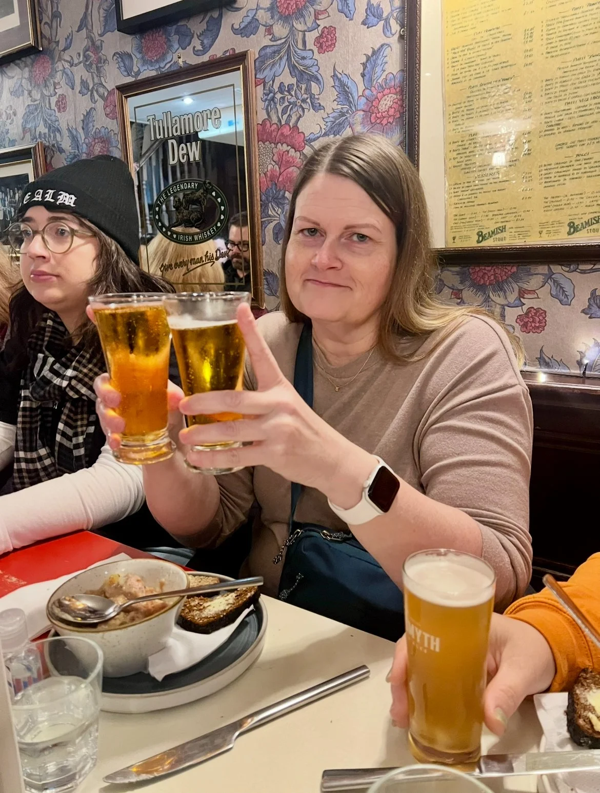 Dinner was in a small, local pub. Things got lively fast. We played a couple of Irish drinking games—“Fingers,” where you guess how many fingers will remain on the glass (loser downs a whiskey), and “Splitting the G,” trying to sip your Guinness so the foam lands exactly in the middle of the letter G. A few people nailed it, most didn’t, and watching everyone fail spectacularly was worth the price of dinner alone.
