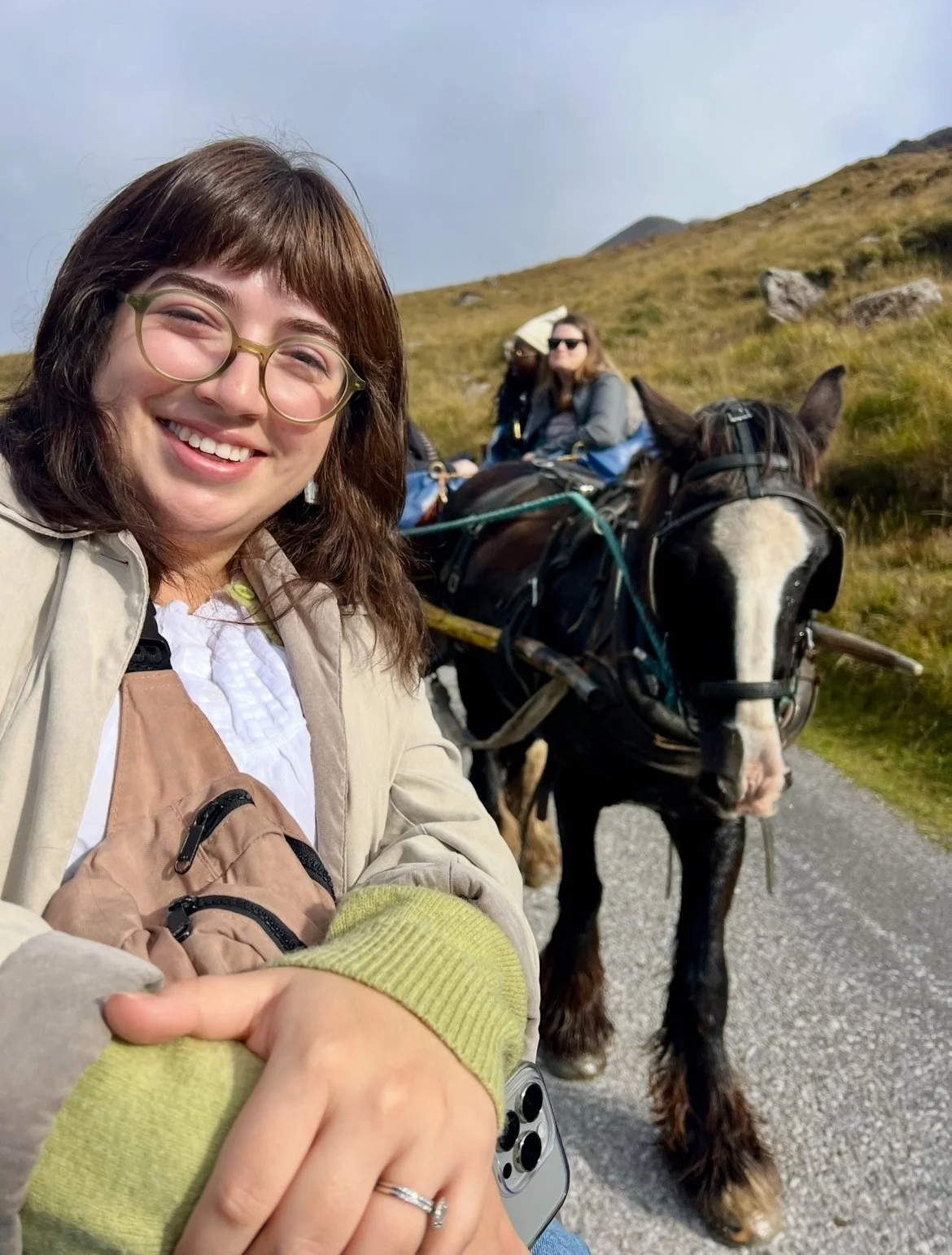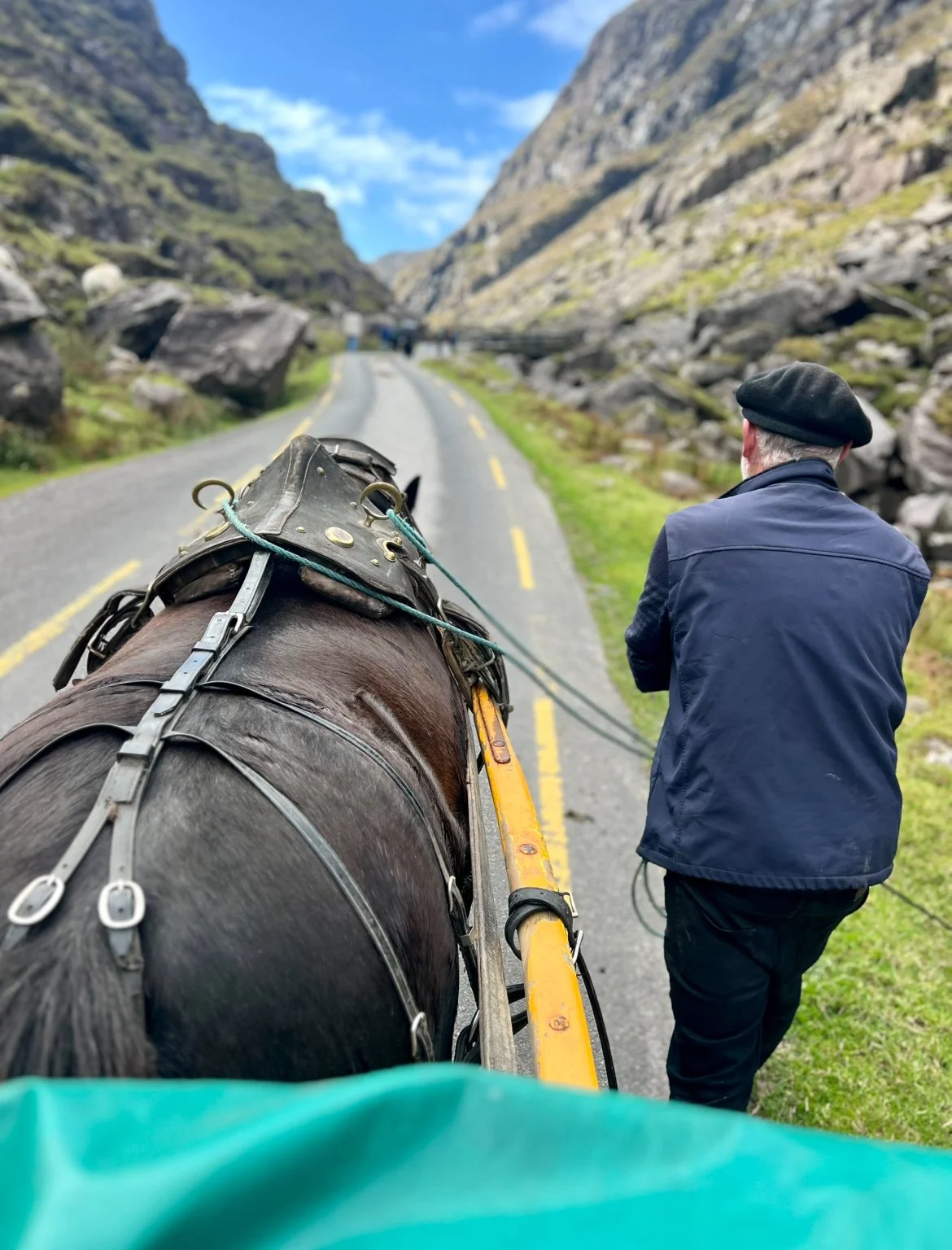 We started the morning with a jaunting car ride through the Gap of Dunloe—four to a cart, bundled against the chill, while our jarveys traded jokes like they were currency. At one point it hit me: Ana and the horse behind us, Buster, had the exact same haircut. Somehow, it fit.